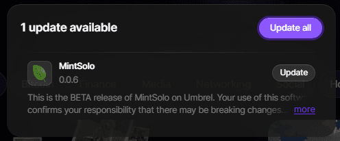We encourage all users of our MintSolo App for Umbrel to update to this version as soon as possible. With Umbrel, you should see an update notice and a simple one-click upgrade button.