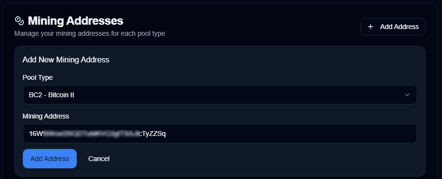 Go to “Settings”, and in the Mining Addresses section, click on the “Add Address” button, select the “BC2” pool type, then input your Mining address (see below example)