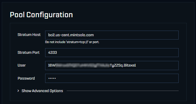 In this step, you are going to begin mining on the MintSolo BC2 platform. Use the following information to configure your miner and start mining. Bear in mind that each miner configuration is different, but you should be able to use the values defined here for your miner configuration.